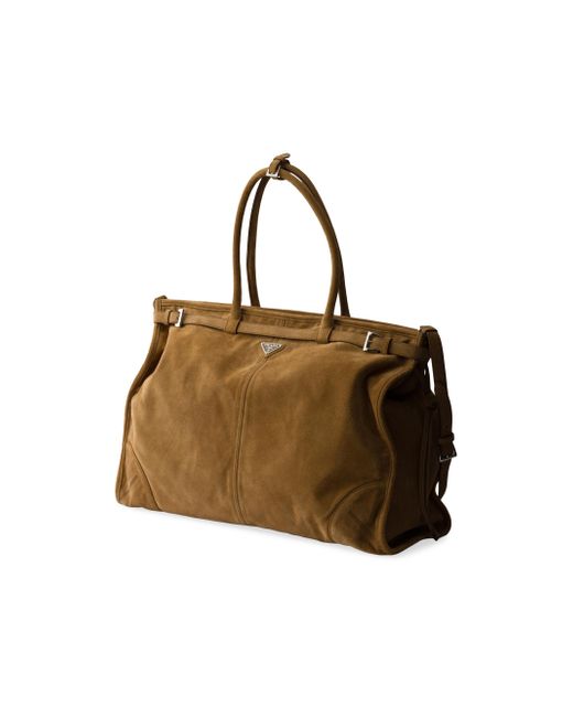 This pragmatic and sophisticated tote is made of suede embellished with elegant straps. The roomy style blends different references in a design with a sleek but distinctive aesthetic, embellished with the iconic enameled metal triangle logo. Decorative straps with buckles Leather handles Detachable, adjustable leather shoulder strap with buckle Maximum length 51.1'' - Minimum length 43.3'' - Maximum drop 24.4'' - Minimum drop 20.4'' Enameled metal triangle logo on the front Zipper closure Interior with zipper pocket Logo-print Re-Nylon and nappa leather lining 100% Calf Leather Imported SIZE 50.0W x 36.0H x 17.0L. Lsd Rtw - Prada Rtw > Prada > Saks Fifth Avenue. Prada. Color: Light Brown.