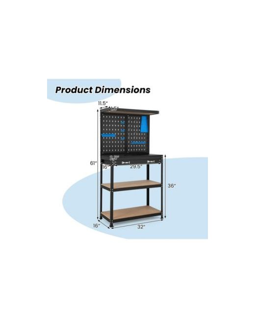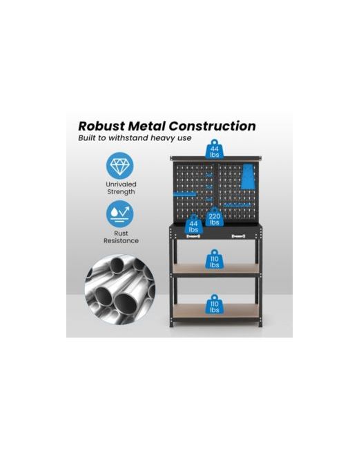 Maximize your workspace with this multifunctional workbench, perfect for garages, workshops, or tool sheds. Designed for efficiency, it features a wide tabletop, upper shelf, 2 drawers, 2 open lower shelves, and dual pegboards with 14 hanging accessories for tools like drills and screwdrivers. Crafted from a durable metal frame with a rust-resistant finish and anti-slip footpads, this workbench offers strength and stability. Easy to assemble and built for heavy-duty use, it's your go-to solution for organized, efficient tool storage.