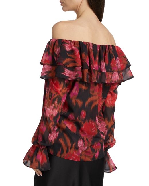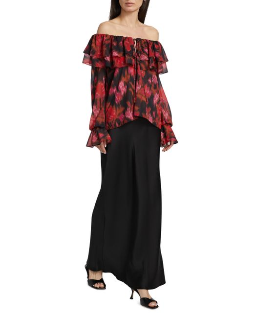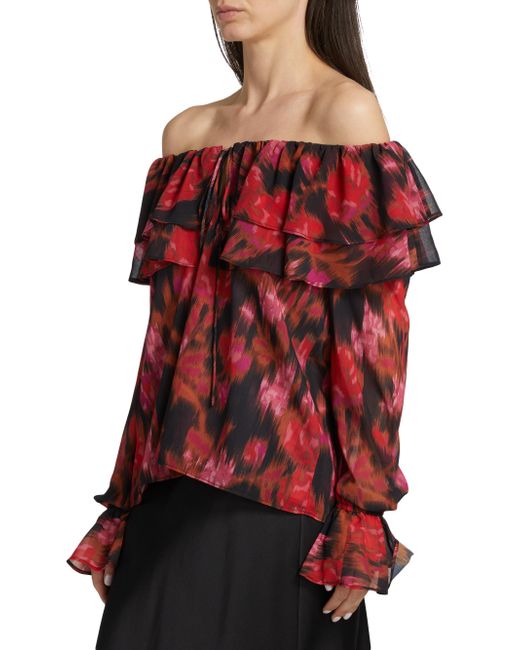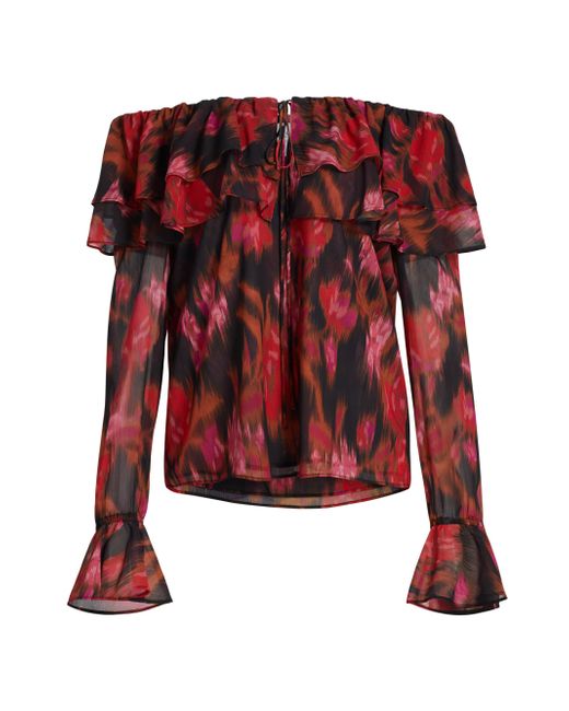 Crafted of floral-printed chiffon, Misa Los Angeles' Patsy top features a ruffled off-the-shoulder neckline, a front keyhole cut out, and long puff sleeves with flared cuffs. Off-the-shoulder neckline Long puff sleeves, flared cuffs Front keyhole cut out Front tie closure 100% polyester Dry clean Imported SIZE & FIT About 17.25" from topline to hem Model measurements: 5'10" tall Model is wearing a US size Small. Contemporary Sportswear - Trend > Misa Los Angeles > Saks Fifth Avenue. Misa Los Angeles. Color: Blur Floral. Size: Medium.