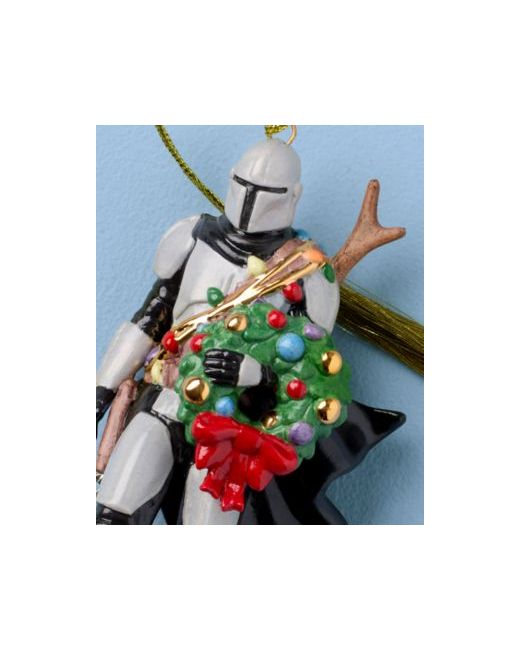 Mando is feeling very merry! Carrying a festive wreath and decorated with shining gold-tone accents, this Mandalorian ornament from Lenox is ready to celebrate the holiday season. The perfect gift for Star Wars fans.