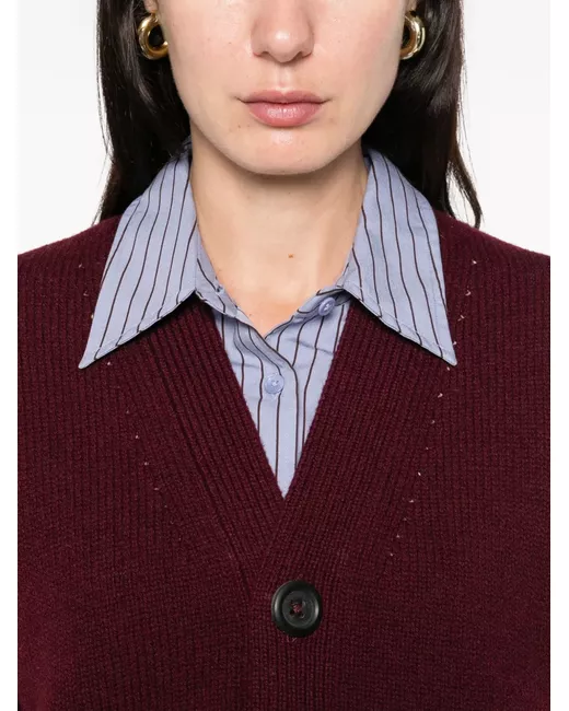 burgundy button fastening V-neck two front pockets ribbed hem ribbed cuffs