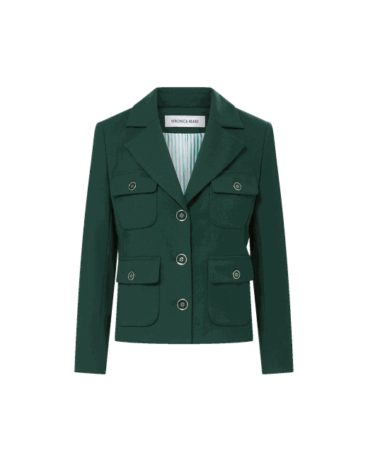A feminine, tailored take on the utilitarian jacket. Crafted from a stretch-suiting blend in dark green, the Schuyler is single-breasted with a boxy fit, featuring a notch lapel and a high break point for added coverage. Four front flap pockets complete the look. Relaxed yet refined, style with high-waisted VB denim for an elevated, everyday look.63% Polyester, 34% Viscose, 3% ElastaneLining: 100% PolyesterMade in the USADry clean onlyStyle #2512SU11311122