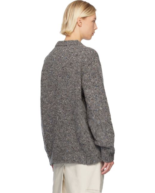 Knit wool sweater. · Marling throughout · Rib-knit V-neck, hem, and cuffs · Dropped shoulders · White stitching at back collar Supplier color: Grey