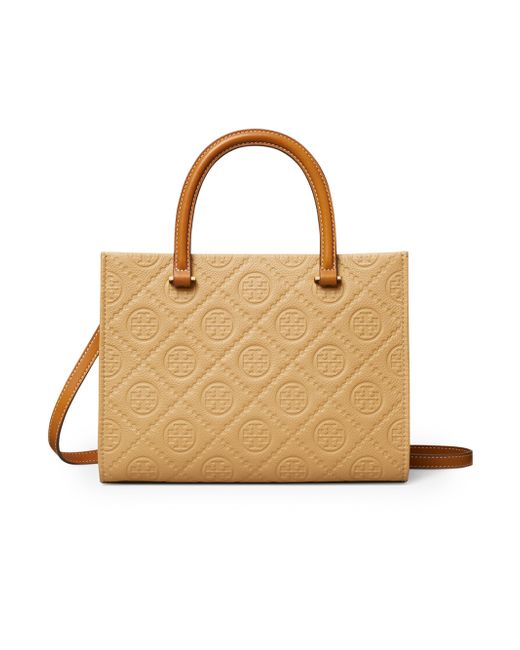Crafted of pebbled leather, this Tory Burch tote bag features embossed T monograms and contrast smooth leather details. Two top handles Removable shoulder strap Magnetic closure Leather Lining: polyurethane Imported SIZE About 9.75"W x 7.5"H x 4.5"D. Handbags - Tory Burch Handbags > Tory Burch > Saks Fifth Avenue. Tory Burch. Color: Tan.