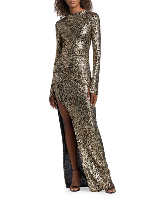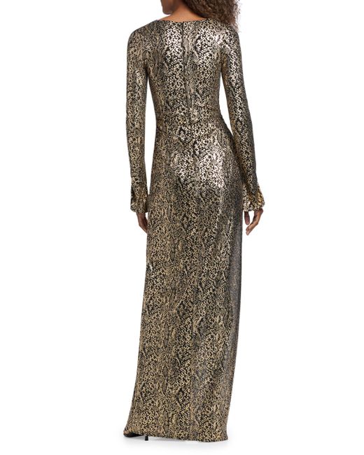 Made in the USA, this gown from LaPointe features a metallic-finished snake print, ruched detail, and high side slit. Mock turtleneck Long sleeves, split cuffs Side slit Concealed back zip closure 91% nylon/5% elastane/4% metallic Machine wash Made in USA SIZE & FIT Model measurements: 5'10" tall Model is wearing a US size Small. Designer Lifestyle - Designer Lifestyle Sport > Lapointe > Saks Fifth Avenue. LaPointe. Color: Pale Gold. Size: XS.