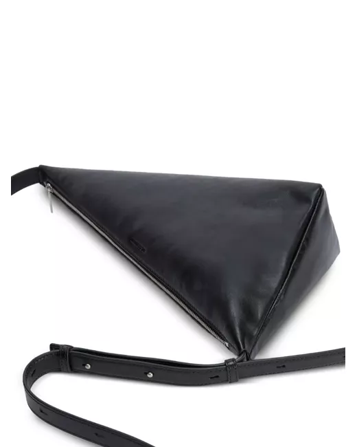 black adjustable shoulder strap embossed logo triangular shape zip closure