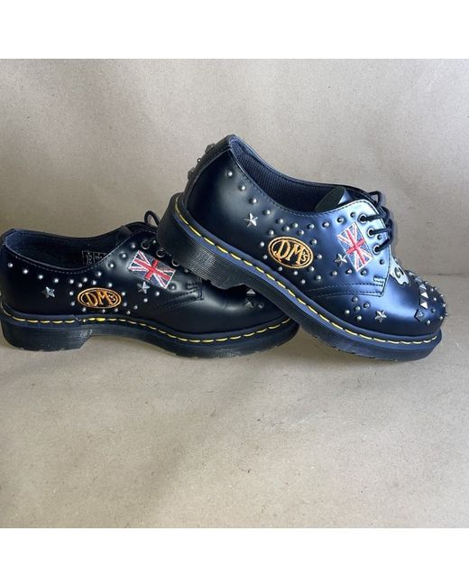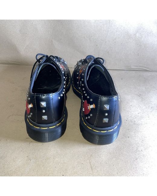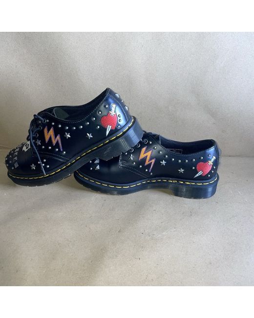 The product is a pair of Dr. Martens UK Size 6 EU 39 black leather oxfords, featuring a round toe shape, lace-up closure, and low block heel. These unisex shoes are perfect for various occasions such as travel, festivals, parties, casual outings, and concerts. The oxfords are accented with studs and embroidered details, making them a stylish choice for the rock and roll music scene. With a durable rubber outsole and leather lining, these shoes are a classic addition to any wardrobe, embodying a punk, grunge, and metal theme.