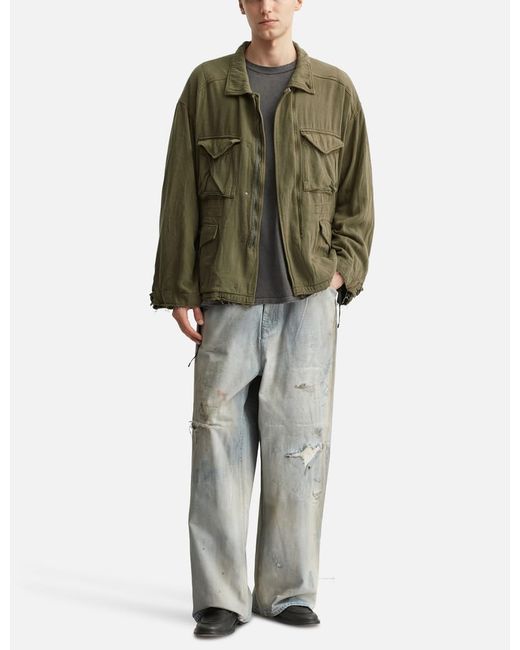 ANCELLMSilk Suede Field JacketMade of noil silk woven in a denim constructionWashed to achieve textured finishingRelaxed fitDraped silhouetteCollar with a button to transform into a stand-up collarFront 2-way zipper closureFour front patch pocketsWaist cordAdjustable cuffs with buttonsRaw-cut cuffsLoose silk threads hanging raw-cut hem edgesMade in JapanColor: Khaki