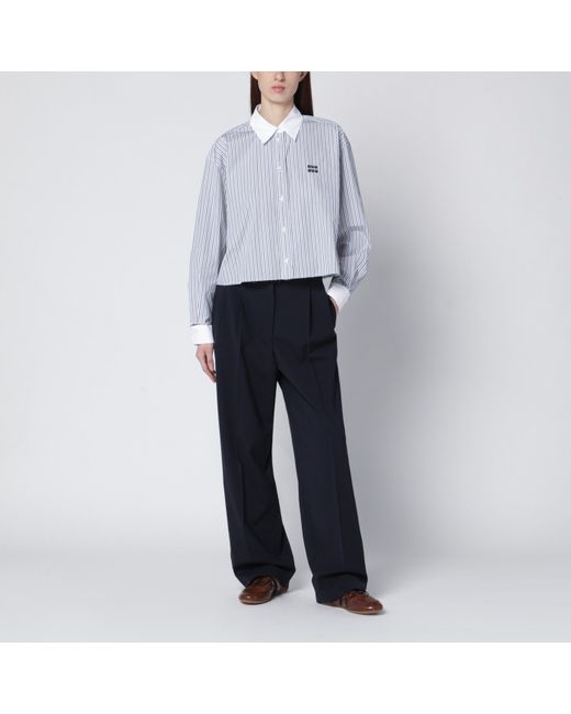 Trousers by Miu Miu in blue stretch wool blend, featuring a fluid wide leg, tone-on-tone embroidered logo lettering on the back, front zip and hook closure, two side pockets, two back welt pockets, belt loops, and front pleats.