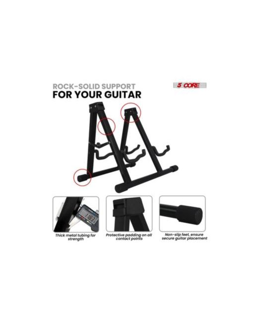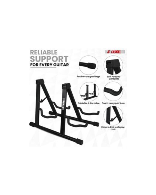 This heavy duty A frame multi guitar stand floor offers unmatched stability and durability with its thick steel construction and reinforced welded joints. Adjustable to fit acoustic, electric, ukulele, cello, banjo, mandolin and bass guitars, this guitar support features soft padding to protect against scratches and dents.Anti-slip rubberized feet ensure your instrument stays secure. The upright guitar stand 2 is easy to use, requiring no special tools for setup, and collapses for convenient portability. Designed for longevity with anti-corrosion paint, this A frame guitar holder provides a secure cradle arm to hold any guitar size. Perfect for musicians seeking a reliable and portable solution to safely display and store their instruments.