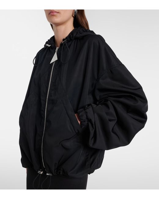 Material: 100% polyester. Care instructions: dry clean. Made in Romania. Designer color name: Black. Item color: black. Lining: 100% viscose. Closure: zipped front. Drawstring hood. Drawstring at the hem for adjustable fit.