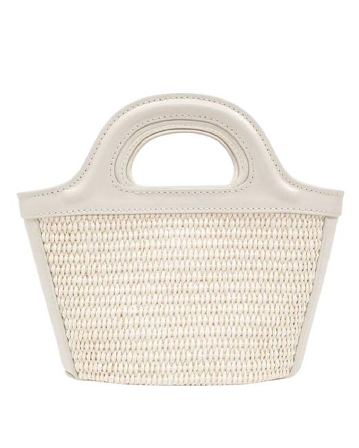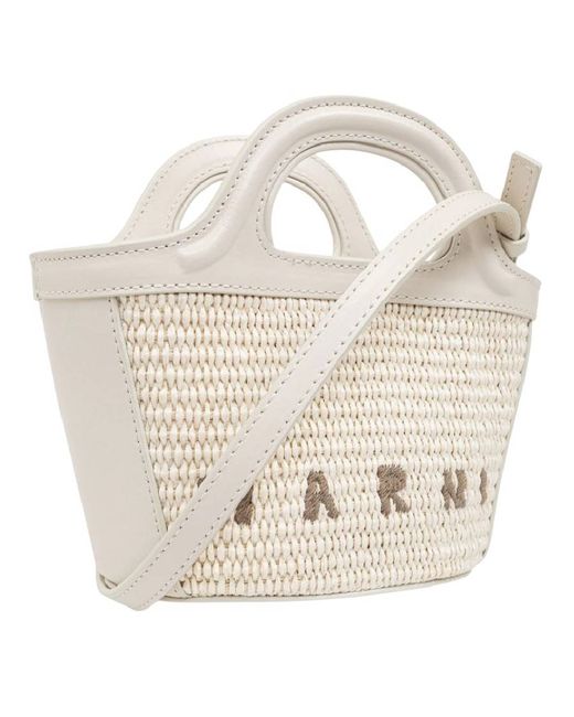 Marni Ladies Shoulder Bag. SKU: BMMP0067Q0. Color: Shell. Marni Tropicalia Micro Adjustable Shoulder Strap Bag. This bag includes two handles, a detachable shoulder strap, and a fabric-lined interior with a single main compartment. It features a leather fastening, a contrasting embroidered logo on the front, and brass hardware with a gold-tone finish. 52% Cotton 48% Polyamide. Made in Italy.
