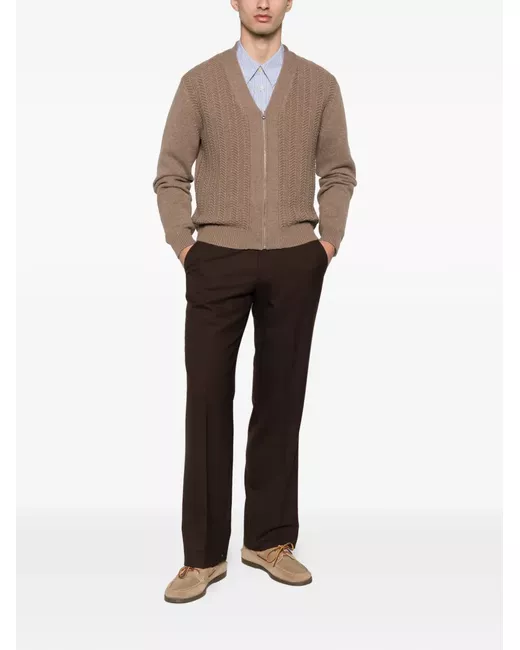 brown wool-cotton blend zip fastening V-neck