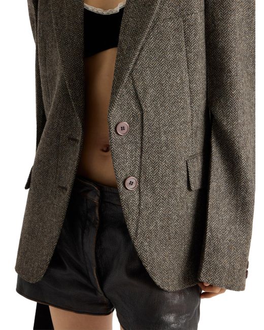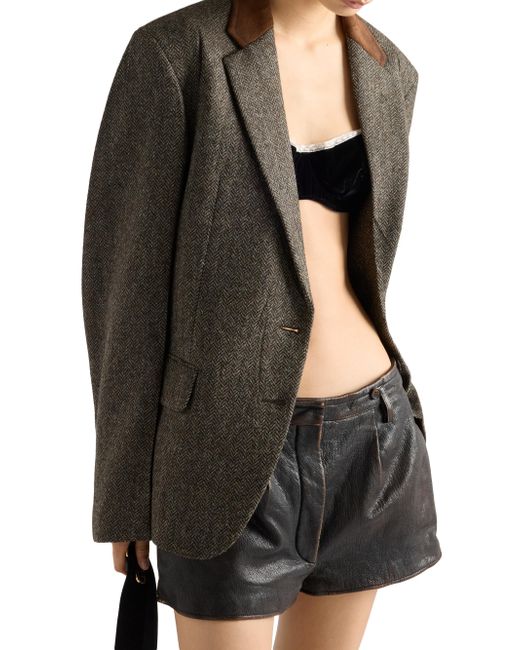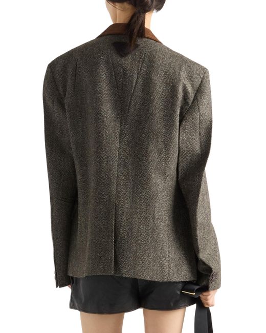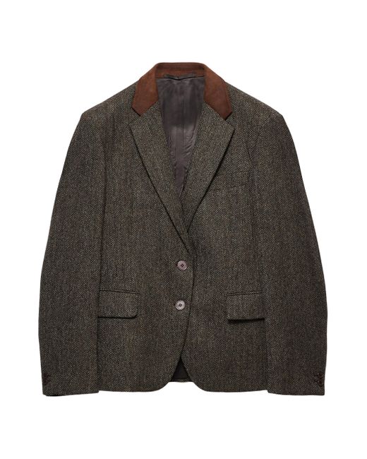 Menswear fit Lined garment Notch lapels with suede detail Front button closure Sleeves with buttons Flapped welt pockets Back vent Shetland wool triangle logo Imported 100% fleece wool - 100% calf leather - 100% trochus niloticus. Lsd Rtw - Prada Rtw > Prada > Saks Fifth Avenue. Prada. Color: Brown. Size: 0.