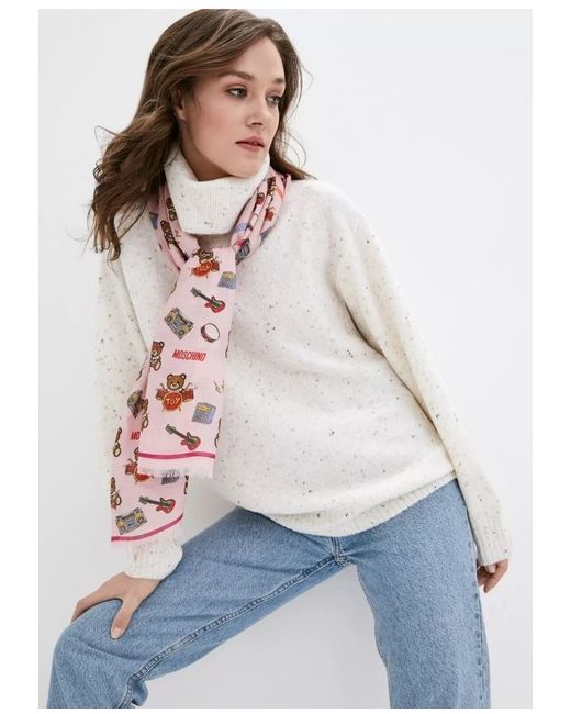 This is a Moschino women's scarf made of 85% modal and 15% wool, measuring 150 cm in length and 45 cm in width. The scarf is pink and multicoloured, featuring a designer theme. It is a rectangle style scarf, suitable for the winter season, and was manufactured in Italy. The scarf is multifunctional and designed by the brand Moschino. Brand new Moschino scarf for woman: 100% authentic gift box included 85% modal, 15% pure wool
