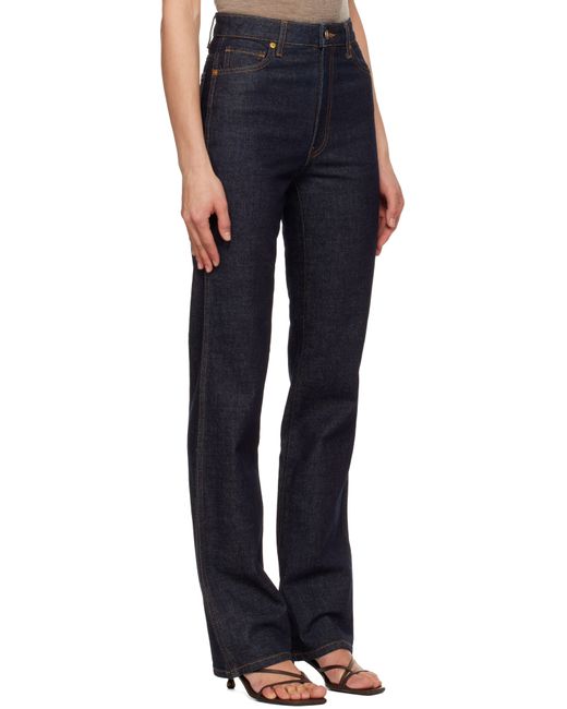 Hand-finished stretch denim jeans. · High-rise · Belt loops · Five-pocket styling · Zip fly · Logo-engraved gold-tone hardware · Contrast stitching in tan Supplier color: Benson