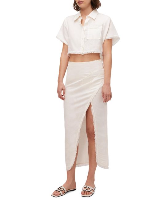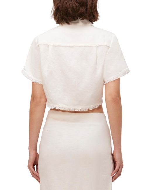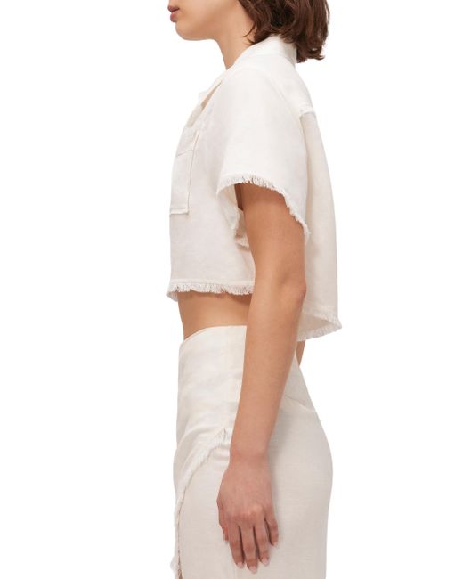 Crafted of a linen blend, the Solange cropped shirt from SIMKHAI features a spread collar, a chest patch pocket, and a refined button-front placket. The piece is completed with fringed trim. Spread collar Short sleeves Chest patch pocket Button front 59% linen/ 41% viscose Dry clean Imported SIZE & FIT This style is designed for a boxy fit About 14" from shoulder to hem Bust, about 40" Model measurements: 5'10" tall Model is wearing a US size Small. Outerwear And Swimwear - Contemporary Swim > Simkhai > Saks Fifth Avenue. SIMKHAI. Color: White. Size: XS.