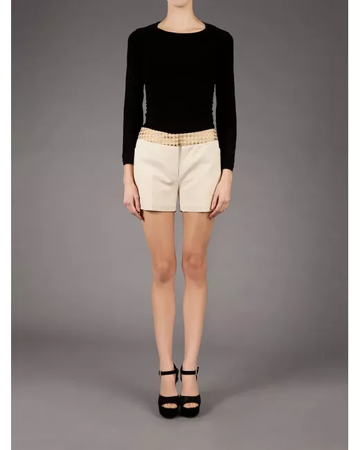 Cream cotton blend shorts from Giles featuring two back patch pockets, a gold-tone checked waistband and a concealed front fastening.