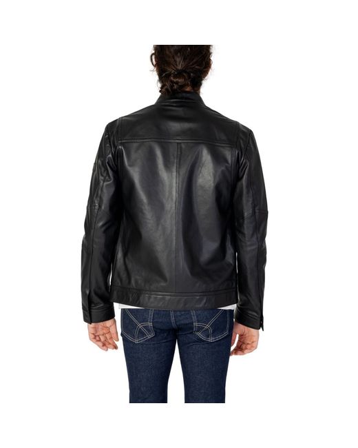 Stylish black leather jacket with zip fastening, Made from 100% leather for durability, Plain pattern adds a touch of simplicity, Front pockets provide ample space for essentials, Ideal for spring and summer, Designed for men, Dry clean only