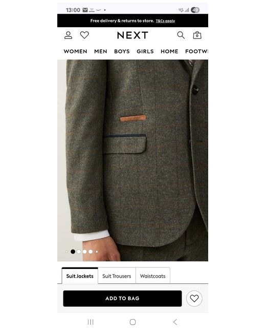 I bought this suite a year ago. But due to sudden weight loss, never got to wear it! it now doesn't fit me. it's still a current stocked item at Next and you can still buy the matching waistcoat from them if required.
