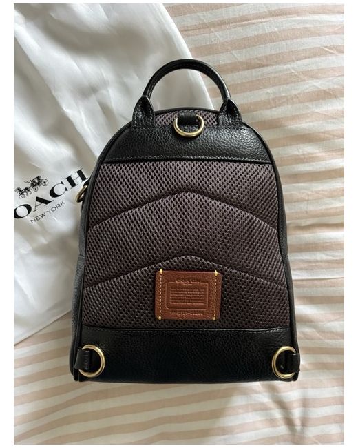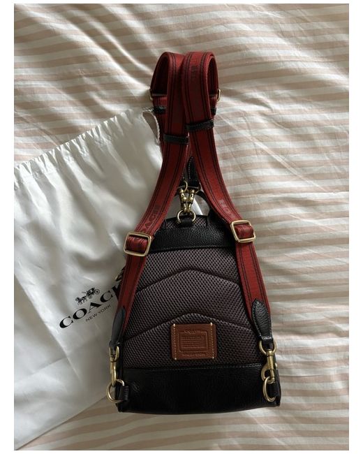 COACH Charter 18 Grained Leather Backpack. Brand new with tag and dust bag. Top handle, two detachable adjustable red canvas shoulder straps, detachable designer hanging tag, brown leather trims, debossed designer logo at zip-fastening patch pocket, dark purple mesh back, appliquƩd designer patch, brushed gold-tone hardware, internal slip compartment, fully lined Zip fastening around top Width: 7.5 inches/ 19cm Height: 10 inches/ 25cm Depth: 3.5 inches/ 9cm Top handle drop: 2.5 inches/ 6cm