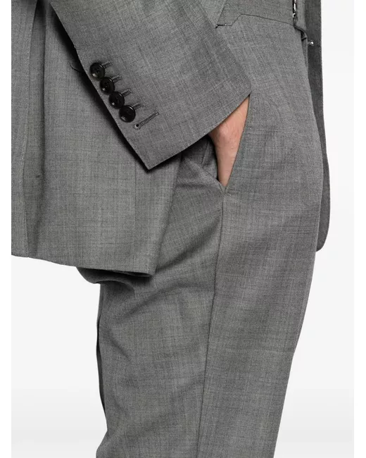 grigio chiaro chiusura frontale con abbottonatura due tasche frontali con pattina chiusura nascosta frontale con bottone, gancio e zip due tasche a filetto posteriori con bottone