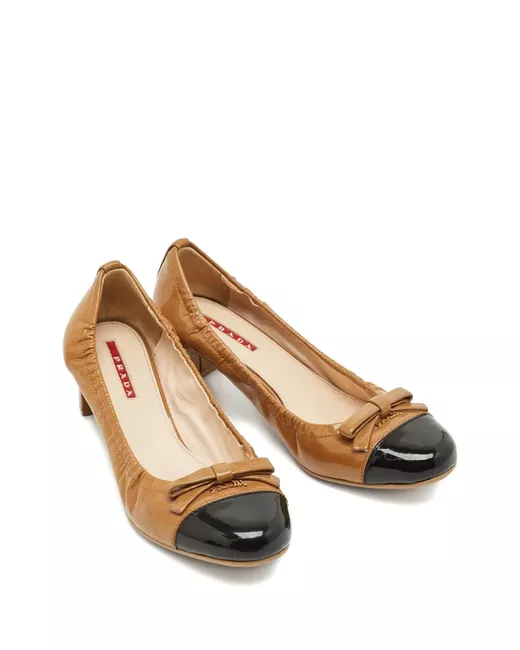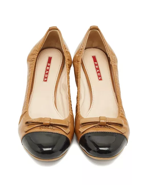 brown patent leather bow detail block heel contrasting cap toe glossy finish Condition: GOOD. This previously owned and used item is in good condition with minimal signs of use. This may include fading of material or plating and scratches.