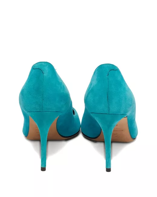 blue suede slip-on style pointed toe stiletto heel gold-tone toecap Condition: GOOD. This previously owned and used item is in good condition with minimal signs of use. This may include fading of material or plating and scratches. This piece comes complete with a protective dust bag.