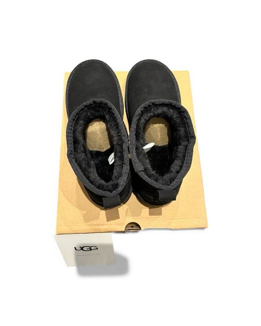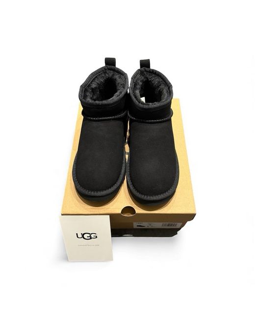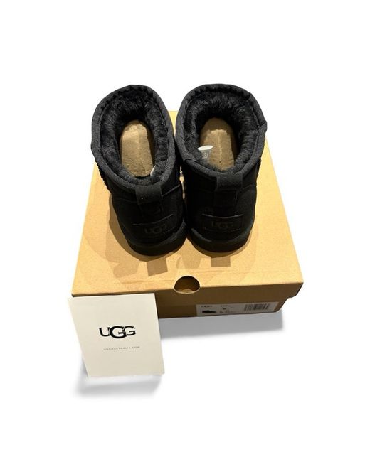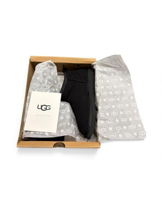 Same day shipping Message for questions The UGG Classic Ultra Mini Women's Ankle Boot in Black, UK size 6, is a stylish and comfortable choice for the winter season. With a round toe, flat heel, and ankle shaft style, these boots feature a pull-on closure and are made with suede upper material and sheepskin lining for added warmth. The rubber outsole provides traction, making them perfect for casual occasions. The iconic UGG brand and classic Australian theme add a touch of sophistication to these versatile boots, making them a must-have for any woman's wardrobe.