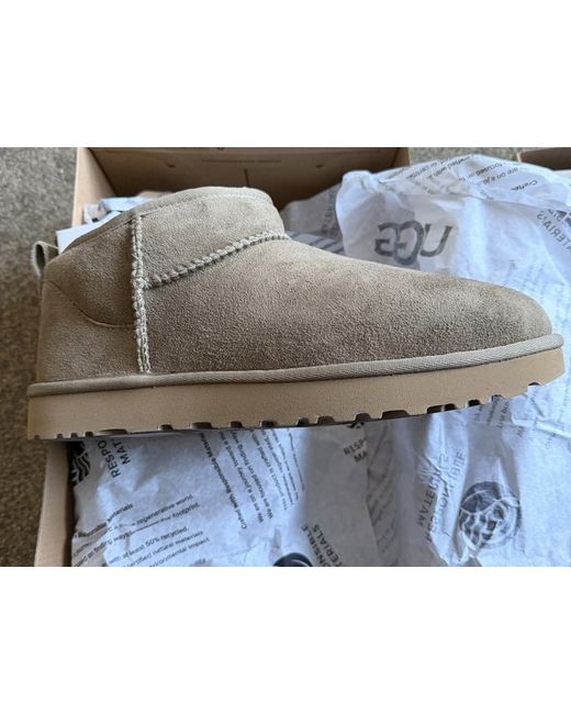 The UGG Classic Ultra Mini Women's Boot in size 8 is a stylish and comfortable ankle boot perfect for casual occasions in the winter season. Made with sheepskin lining and shearling fabric type, these boots feature a round toe shape and a low heel height for all-day wear. The light brown suede upper material and rubber outsole provide durability and a classic UGG logo accent adds a touch of luxury to the design. This bootie from the Ugg Classic product line is a must-have for women looking for a reliable and fashionable footwear option. £149.99 RRP