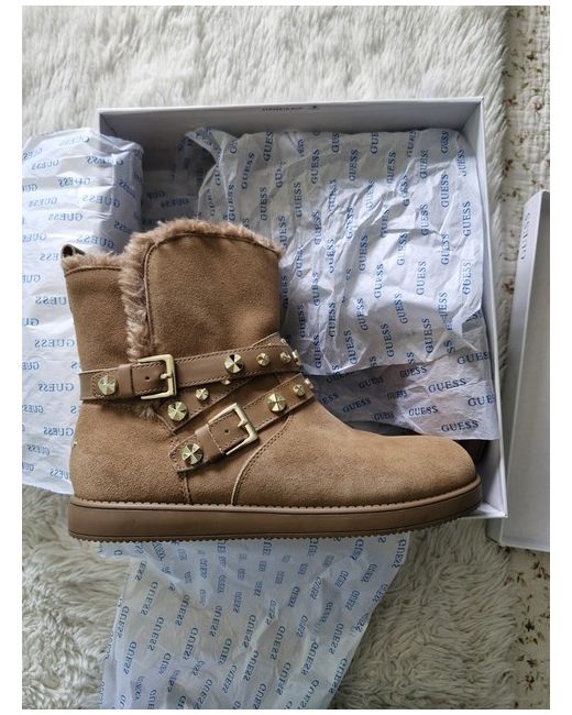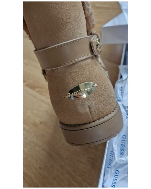 These GUESS Suede Boots in size 40 are a stylish and versatile addition to any woman's wardrobe. These ankle boots feature a beige suede upper with a shearling style lining, providing both comfort and warmth. The casual design makes them perfect for everyday wear, while the GUESS brand adds a touch of luxury. BNIB