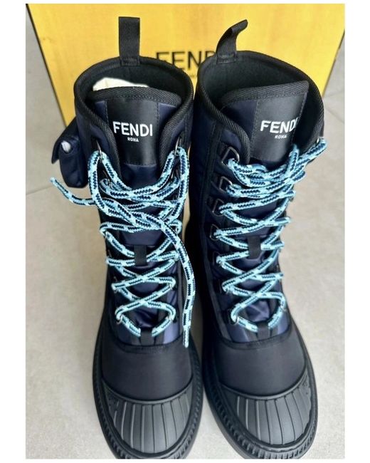 Cloth snow boots Fendi women biker lace up boots in navy canvas and black latter with lace -up with Baguette pocket on the side. 18 CM SHAFT - 5 CM HEEL. With an Extra black and white lace . Made of nylon. Rubber lug sole with embossed Fendi lettering on the point. It comes with the original box but as it shows in the pictures the box is damaged