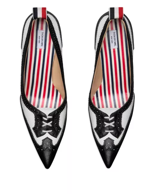 black and white pebble-grain texture wingtip design Signature striped grosgrain loop tab hight heel leather sole