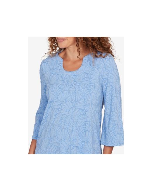 Textured with a soft floral jacquard, this feminine knit top features a unique horseshoe neckline and graceful flared sleeves. Designed with flattering front seaming and crochet trim along the hem and cuffs, it's a fresh spin on a solid staple.