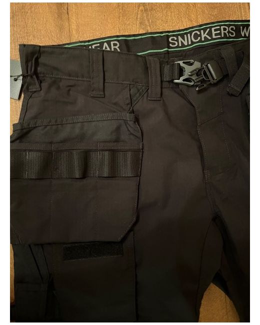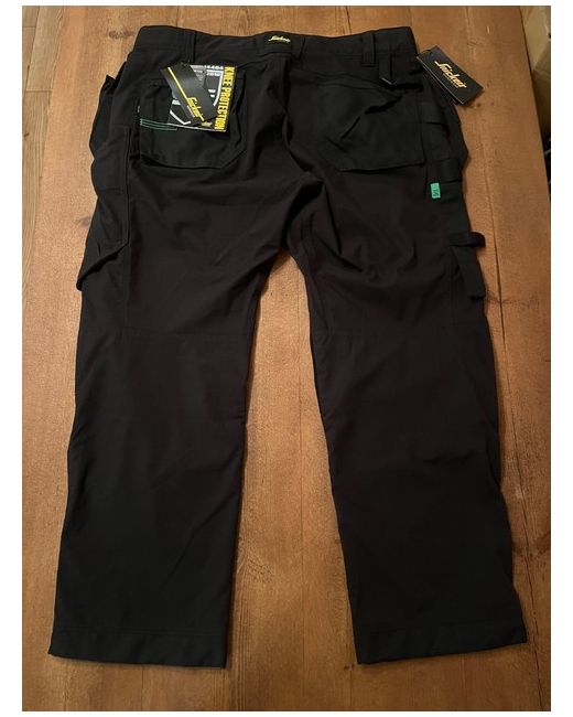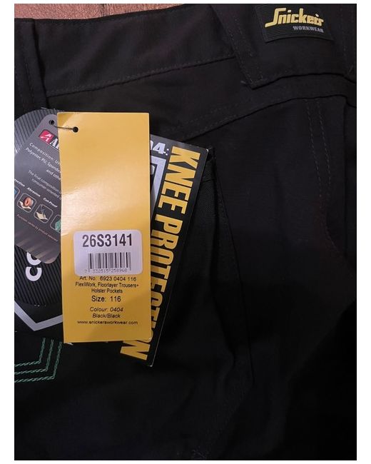 Snickers 6923 FlexiWork Floorlayer Work Trousers+ Holster Pockets. Snickers size 116. Model: 6923. Material: Main: 65% Polyester, 35% Cotton, 225 g/m2. Black / black. Full stretch Armortex fabric. Certified floor layer knee pockets (standard EN14404).