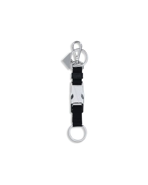 The fabric Keyring by Prada is a practical and modern accessory, made of durable fabric and embellished with the logo embossed on the security buckle. Equipped with a key ring and carabiner, it offers a dual mode of use, combining functionality and style in an essential and distinctive design. Season: SS26 Composition: 100% Nylon