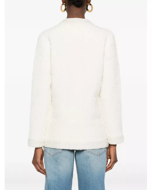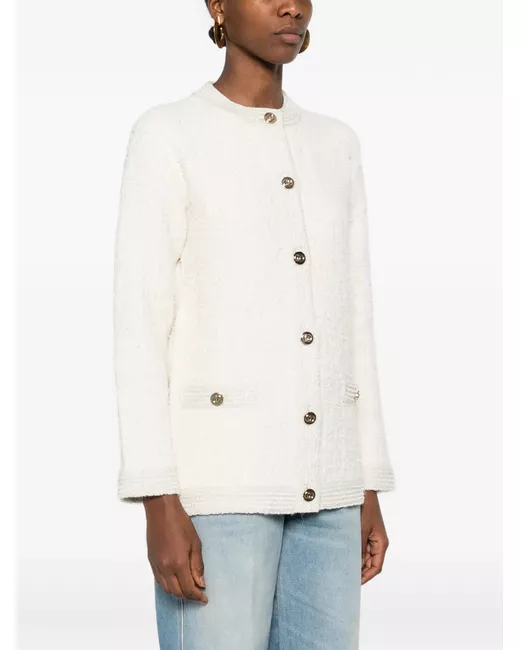 beige textured weave button fastening two patch pockets trimmed edges crew neck