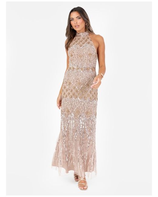Crafted in a soft taupe blush hue, its sleeveless bodice features a halter neckline and striking open back, balancing elegance with allure. The fully embellished profile showcases intricate celestial motifs of stars and radiant rays, designed to catch the light from every angle.