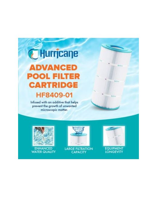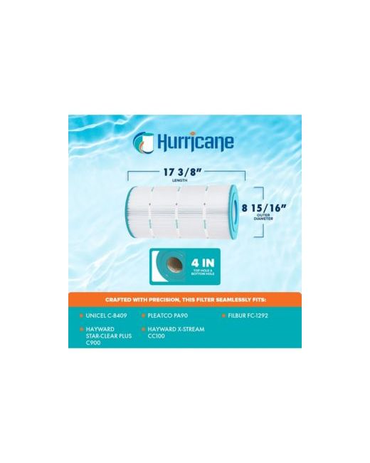 Dive into the realm of pristine waters with the Hurricane HF8409-01 Advanced Cartridge Filter, where unparalleled cleanliness awaits. Crafted with meticulous precision, this filter guarantees seamless compatibility with a range of models including Unicel C-8409, PA90, Filbur Fc-1292, Hayward Star-Clear Plus C900, Hayward X-Stream CC100, Sta-RIte Pxc-95, Waterway Clearwater Ii 100, Waterway Pro-Clean 100, and other compatible models. With dimensions measuring 17 inches in length, an outer diameter of 8.94 inches, and top and bottom holes being 4 inches, achieving an ideal fit is effortless, measure your current filter for a flawless match.Experience a new level of filtration prowess with the advanced point bond filter media of this spa essential, elevating filtration effectiveness beyond traditional non-woven materials. From biomass to dirt, debris, hair, leaves, and even critters, this filter cartridge is a formidable barrier, leaving your pool or spa immaculate and inviting.