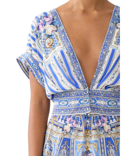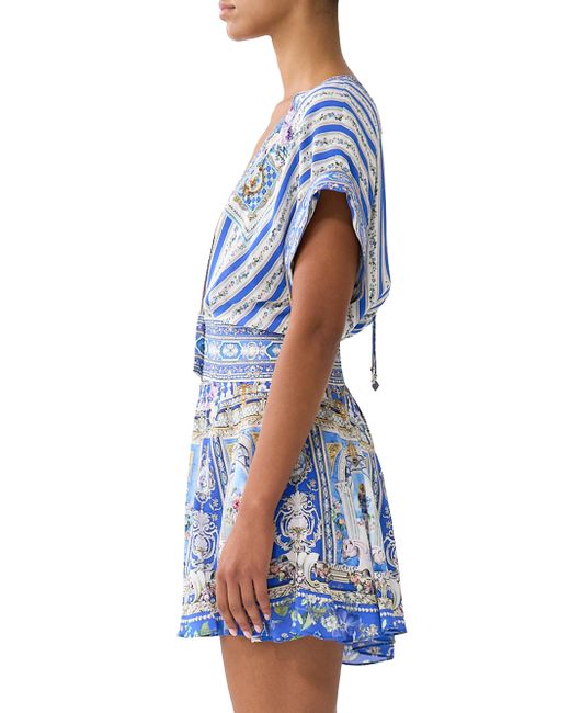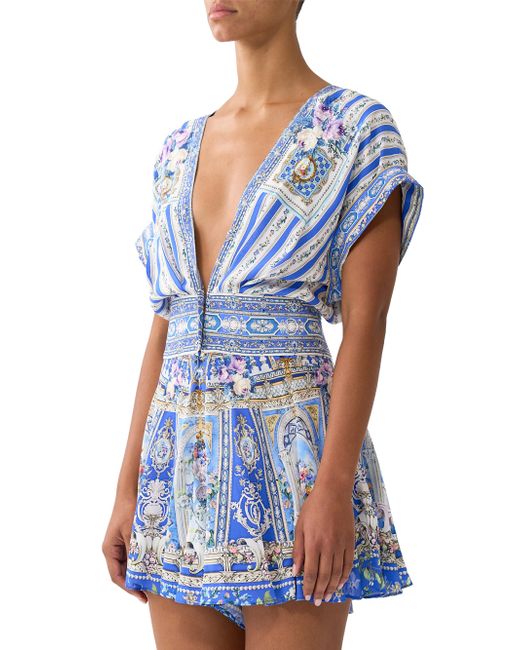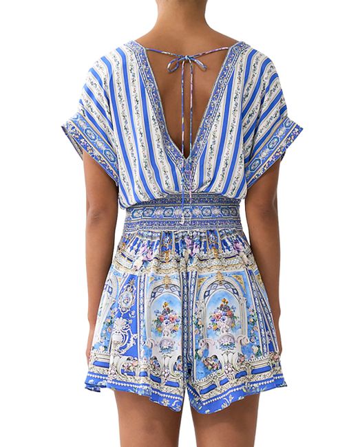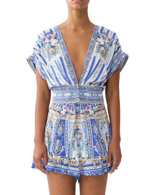 Crafted of luxurious silk, Camilla's playful romper features the brand's Ottoman print, a defined button-front waist, and a daring V-neckline. Plunging V-neck Short sleeves Banded waist Button-front closure 100% silk Dry clean Imported SIZE & FIT Model measurements: 5'10" tall Model is wearing a US size Small ABOUT THE BRAND Camilla's line of warm-weather separates, dresses and swimwear is reminiscent of the brand's birthplace on the shores of Bondi Beach in Australia. Renowned founder and Creative Director Camilla Franks oversees exquisitely produced and often-handmade designs. Created for the artistic globetrotter who can't get enough of the beach, Camilla's pieces come to life through vivid color and print. Outerwear And Swimwear - Contemporary Swim > Camilla > Saks Fifth Avenue. Camilla. Color: Blue Multi. Size: Medium.