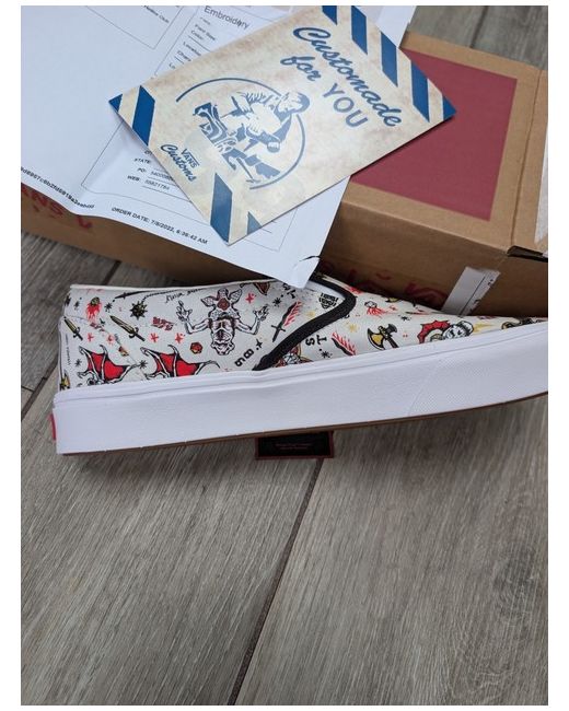 I have just unboxed these for the pictures. These are unworn US size 10, UK size 9, Stranger Things Hellfire club, slip on shoes. They are a unisex shoe and are new in the box, with all Vans packaging. The shoes came directly from the Vans website. These make the perfect shoe in readiness for the New series of Stranger Things showing this year. Be the envy of all your friends with these fantastic looking Vans.