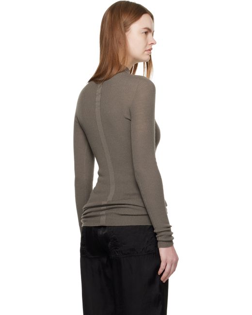 Lightweight rib-knit virgin wool sweater. · RWS-certified virgin wool · Mock neck · Saddle shoulders · Central garter-stitch stripe at back Supplier color: Dust