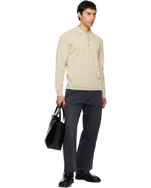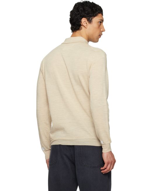 Lightweight knit wool-blend polo. · Patchwork detailing at front hem · Rib-knit spread collar and cuffs · Four-button placket · White stitches at back collar Supplier color: Beige