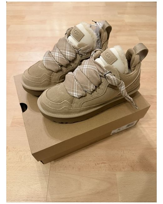 Brand new and never worn UGG Lowmel trainers in the sand colourway, UK size 4. These shoes combine UGG’s signature comfort with a modern, street-style design. Featuring a premium suede upper with breathable mesh panels, chunky cushioned sole for all-day comfort, and lace-up fastening for a secure fit. The neutral sand colour makes them easy to style with both casual and smart-casual outfits. Soft padded collar and tongue add extra comfort, while the durable rubber outsole provides good grip.