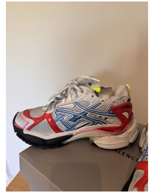 The Balenciaga Runner Gradient Sneakers in multi-colour, size 38, are stylish trainers designed for women. Made in Italy with a mesh upper material, these sneakers feature a standard shoe width and a vibrant multicoloured design perfect for the spring season. The iconic Balenciaga brand ensures high quality and a trendy sneaker style suitable for various activities, especially racing. These sneakers are a fashionable and versatile addition to any woman's footwear collection. These sneakers are immaculate only worn once.