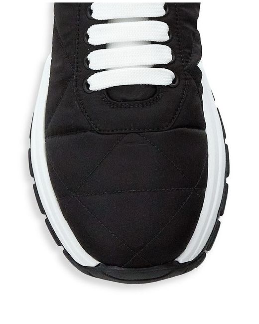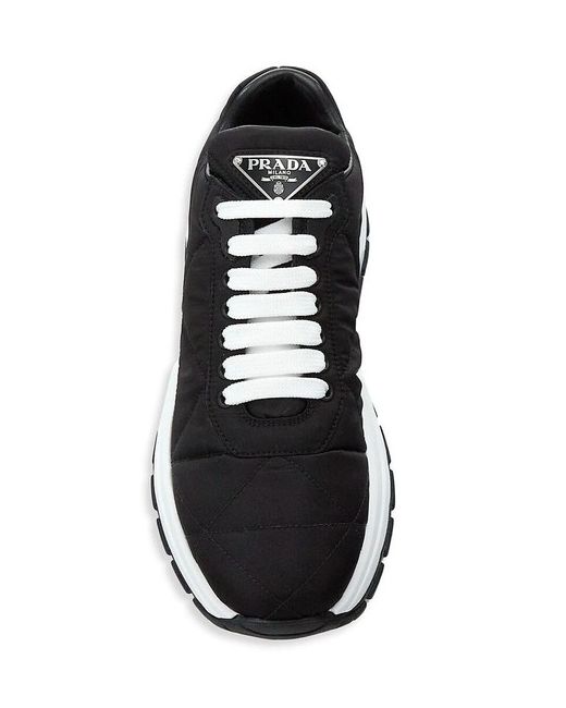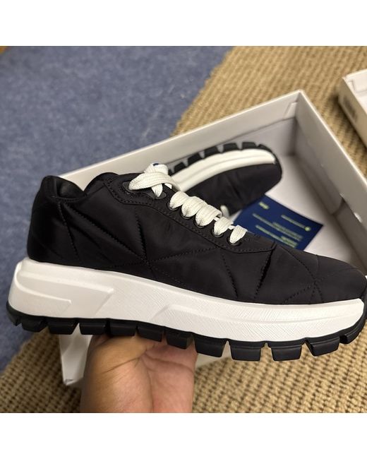 The Prada Women's Nylon Triangle Runner in black is a stylish trainer in UK size 3 (EU 36). Made with a nylon upper and a rubber outsole, these shoes offer both comfort and durability. The iconic Prada branding adds a touch of luxury to this sporty design, making them a fashionable choice for women looking for a sporty yet chic footwear option. Ideal for casual wear, these trainers are perfect for adding a touch of sophistication to any outfit.