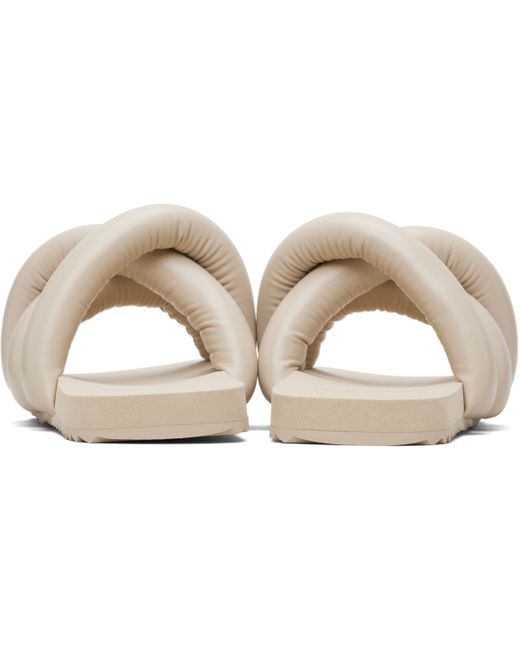 Padded buffed faux-leather slip-on sandals. · Open square toe · Crisscrossing straps at vamp · Logo embossed foam rubber footbed · Treaded rubber sole Supplier color: Beige