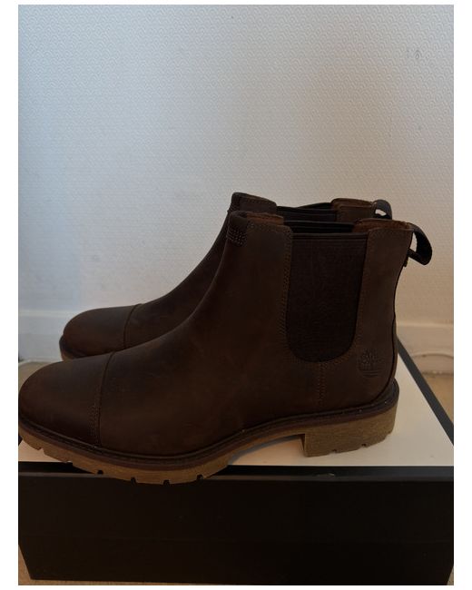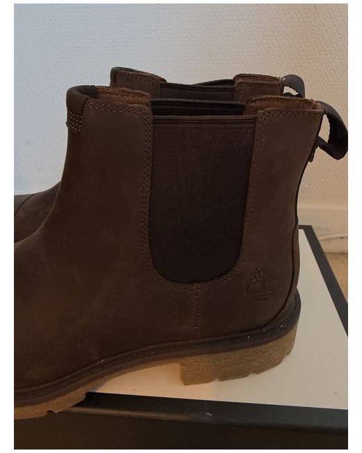 The product is a pair of Timberland men's Chelsea boots in UK size 9, featuring a stylish brown colour and a durable rubber outsole.