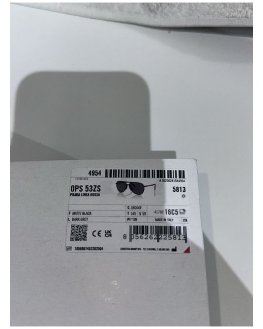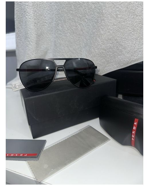 Prada Linear Rossa metal sunglasses RRP-£302 Style number: PR A51S Frame 100% metal; lens 100% polycarbonate Frame shape: square 100% UV-protected lens, logo-branded sides, tonal hardware Lens width 5.8cm, bridge size 1.7cm, temple length 14cm Wipe with a clean, dry cloth Comes with hard case and cloth