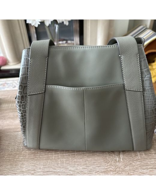 The Radley Women's Bag in pale green is a stylish shoulder bag made from leather, featuring a rectangular shape with a zip closure. The bag has two handles in a matching green leather material, making it easy to carry for casual occasions. It is medium-sized with inner pockets for organization, perfect for everyday use. The bag charm adds a unique touch to this elegant and practical accessory from the Radley brand. Perfect for women who appreciate quality and style in their handbags.